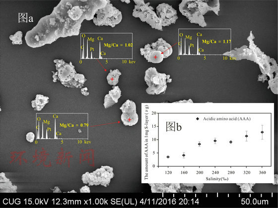 图a 嗜盐古菌Haloferax volcanii DS52诱导形成的原白云石矿物形态以及Mg/Ca