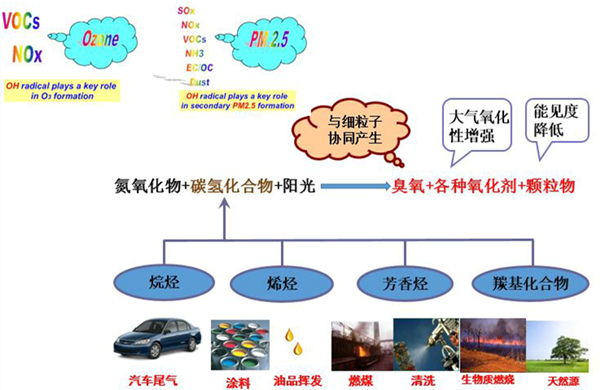图2近地层臭氧的前体物及与细颗粒物(PM2.5)的协同效应