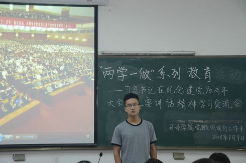 实验班党支部书记夏成城用“自豪、自信、清醒、坚定”概括了自己对习总书记重要讲话的理解;“习总书记的讲话让我真切感受到,青年一代肩负着国家和民族发展的重大责任和使命。”水文与水资源工程党支部书记张林说,听了习总书记的讲话很振奋,他觉得作为大学生党员,应该发挥自己的光和热,带动身边的人,朝着梦想前行;地下水科学与工程党支部书记马晓田总结了中国共产党在95年历史进程中作出的三个伟大的历史贡献。他说:“大学生党员也要经常开展批评与自我批评,不忘初心,继续前行,保持刚正不阿的作风,不断探索真理”。“习近平总书记说青年要勇做走在时代前列的奋进者、开拓者、奉献者,我要积极响应总书记号召,发挥大学生党员的模范带头作用,学习在前不久湖北防汛抗洪一线党员的责任和担当。”环境工程党支部书记严璐谈到;生物专业党支部成员杨泽抛出自己的思考:“为什么中国共产党在95年历程中,面对种种困难和挑战,始终不曾偏离路线?这根源于一代代共产党人坚守马克思主义的坚定信仰。”