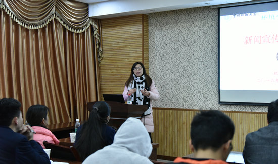 刘妍慧就新闻写作进行讲解。她说,写好新闻稿需要记者对采访对象进行深入采访与细节挖掘,尤其是典型师生人物稿件,要着重挖掘其中的感人之处。在把握新闻要素齐全基础上,要重点从日常事件中寻找其新闻价值。她强调,想写好新闻,需要多琢磨,反复思考,不断修改与提炼,使文章具有价值性、说服力及感染力。