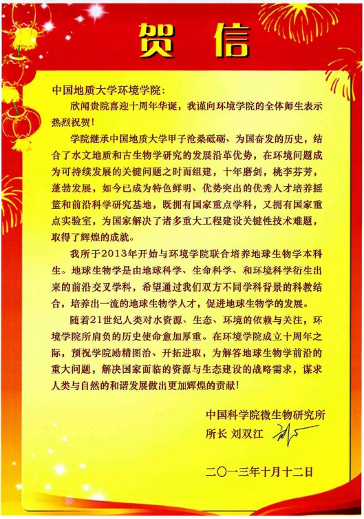 中国地质大学(北京)水资源与免费成人a片 发来院庆贺信