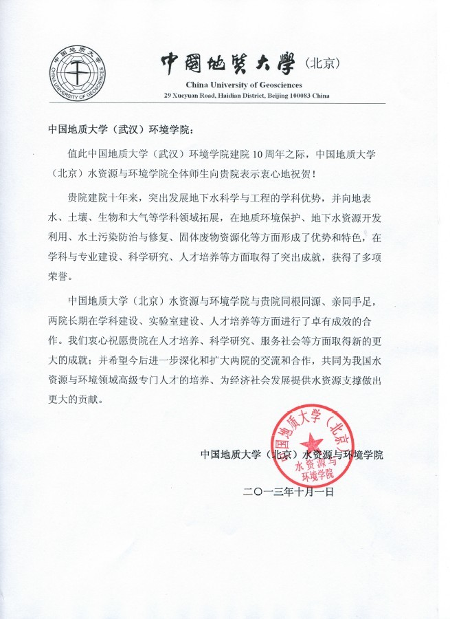 中国地质大学(北京)水资源与免费成人a片 发来院庆贺信