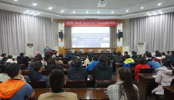 Dion教授介绍了辛辛那提大学概况,从饮用水污染物和存在于地表水、地下水及工业废水等的新兴污染物的处理处置入手,生动地讲述了基于紫外光催化和可见光催化高级氧化技术的研究及应用进展。介绍了紫外可见光体系固体催化剂的活化机理以及在实际水处理过程中所起的作用。Dion教授分享了目前的研究热点,如紫外光-氯以及紫外光-硝酸盐体系的反应机理和应用效能,还指出了未来的研究方向。Dion教授的报告引起了我院师生的强烈反响。