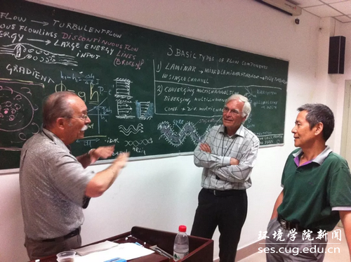 2013年学术报告后靳老师(右一)与国际水文地质学家Toth(左一)和Engelen(左二)交流