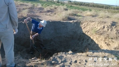 2015年靳老师在新疆工作现场挖坑做试验