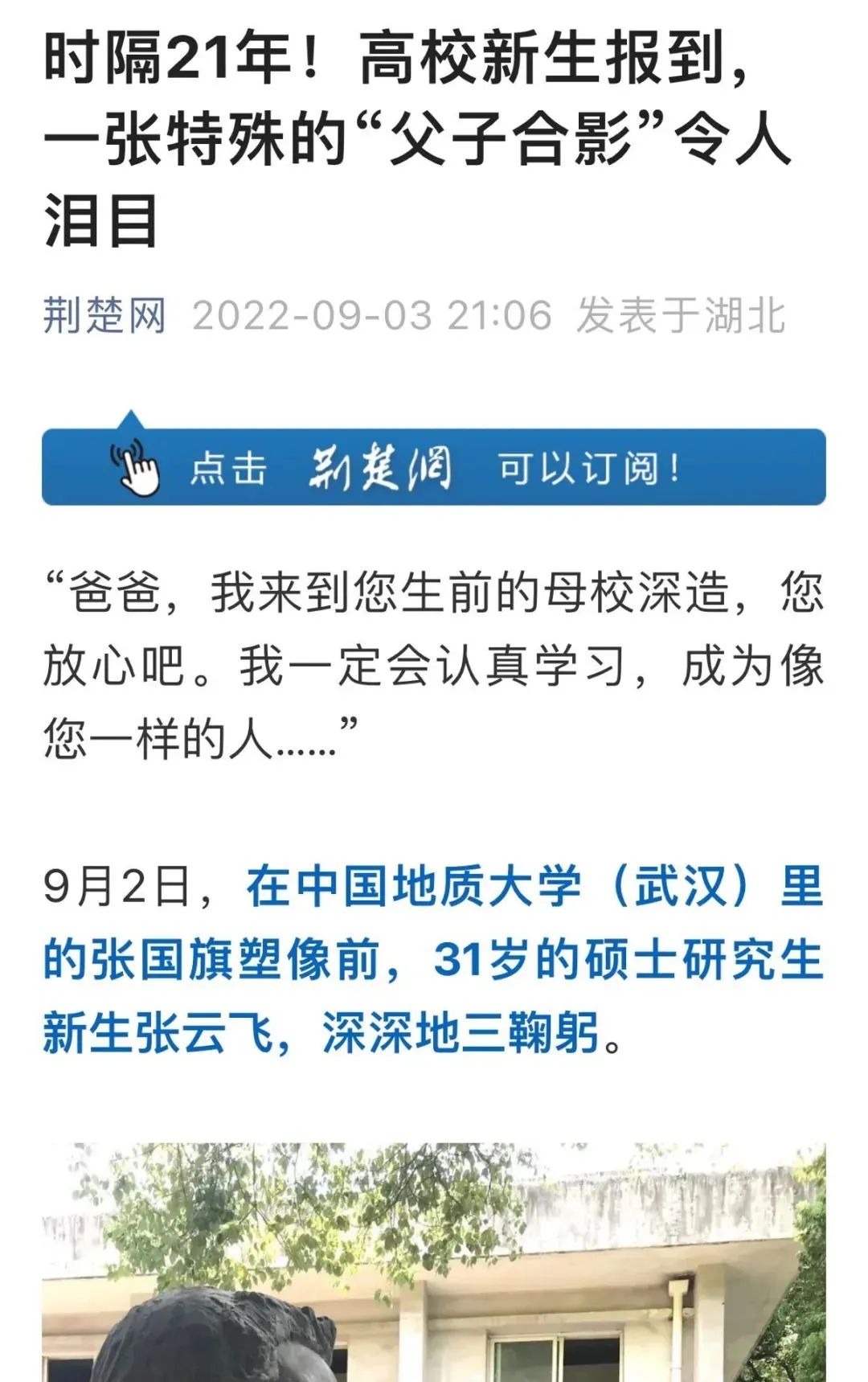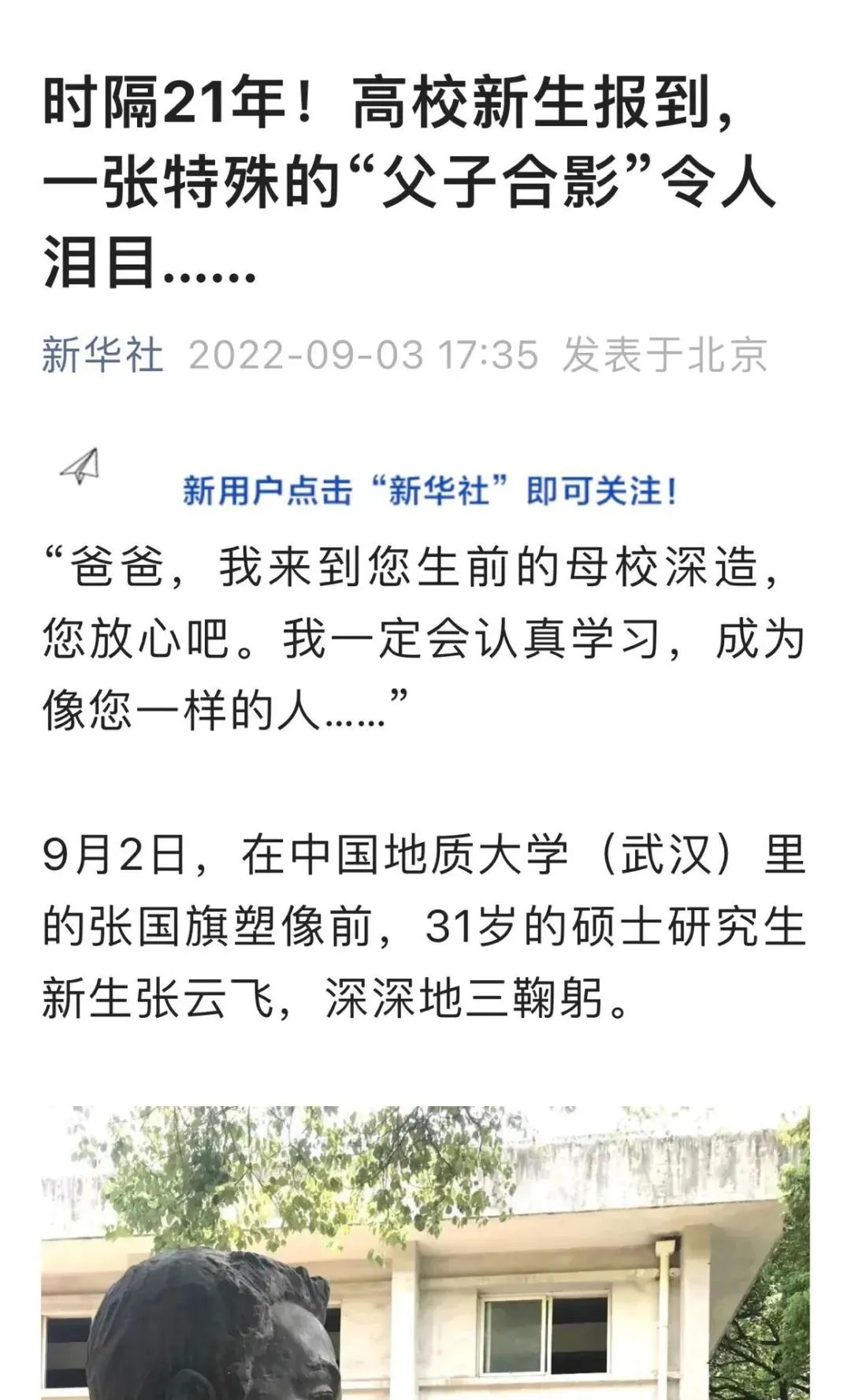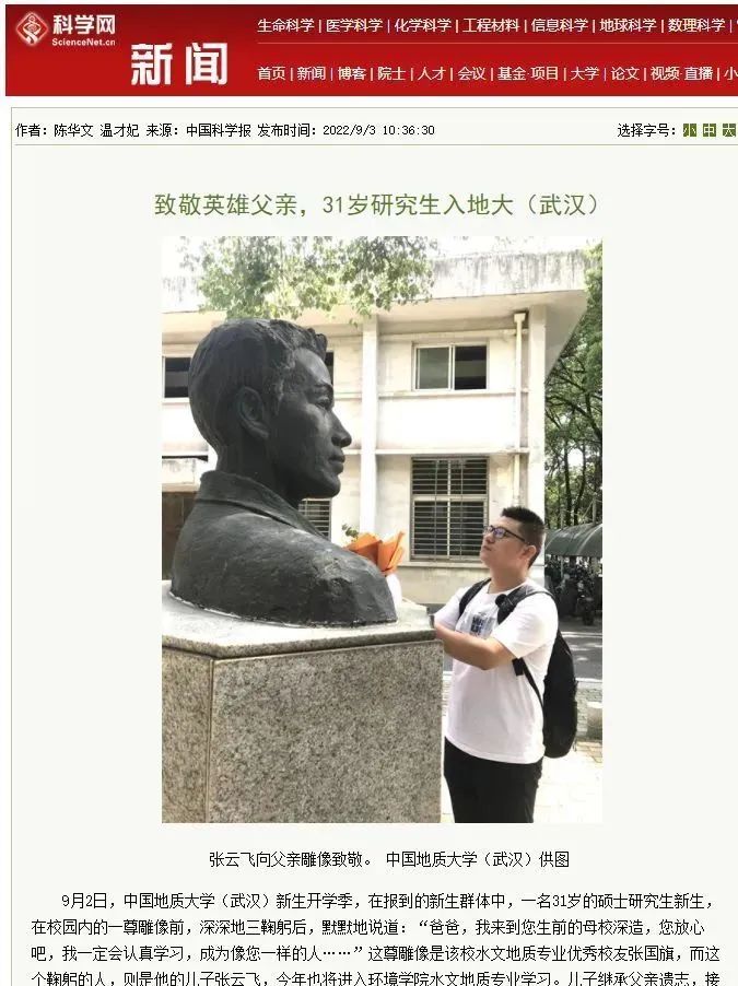 在中国地质大学(武汉)即将迎来70周年校庆前夕,9月2日是该校的新生开学季,英雄校友张国旗之子张云飞,大学毕业工作八年后,已经31岁的他,接过父亲的水文地质学接力棒,来校报到攻读硕士研究生。党委宣传部记者根据新闻线索,进行深入挖掘和采访,撰写长篇新闻通讯,全文如下:
