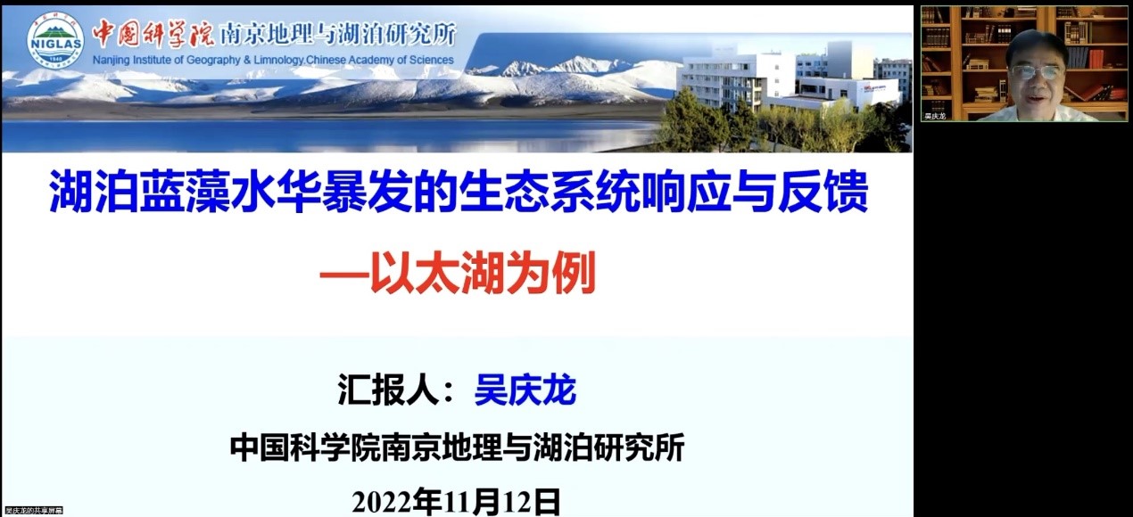 王红梅教授邀请,11月12日,中国科学院南京地理与湖泊研究所吴庆龙研究员以《湖泊蓝藻水华暴发的生态系统响应与反馈——以太湖为例》为题作线上学术报告。该报告是我校校庆七十周年系列学术报告活动“名家论坛”之一,100余名师生参加。王红梅教授主持报告会。