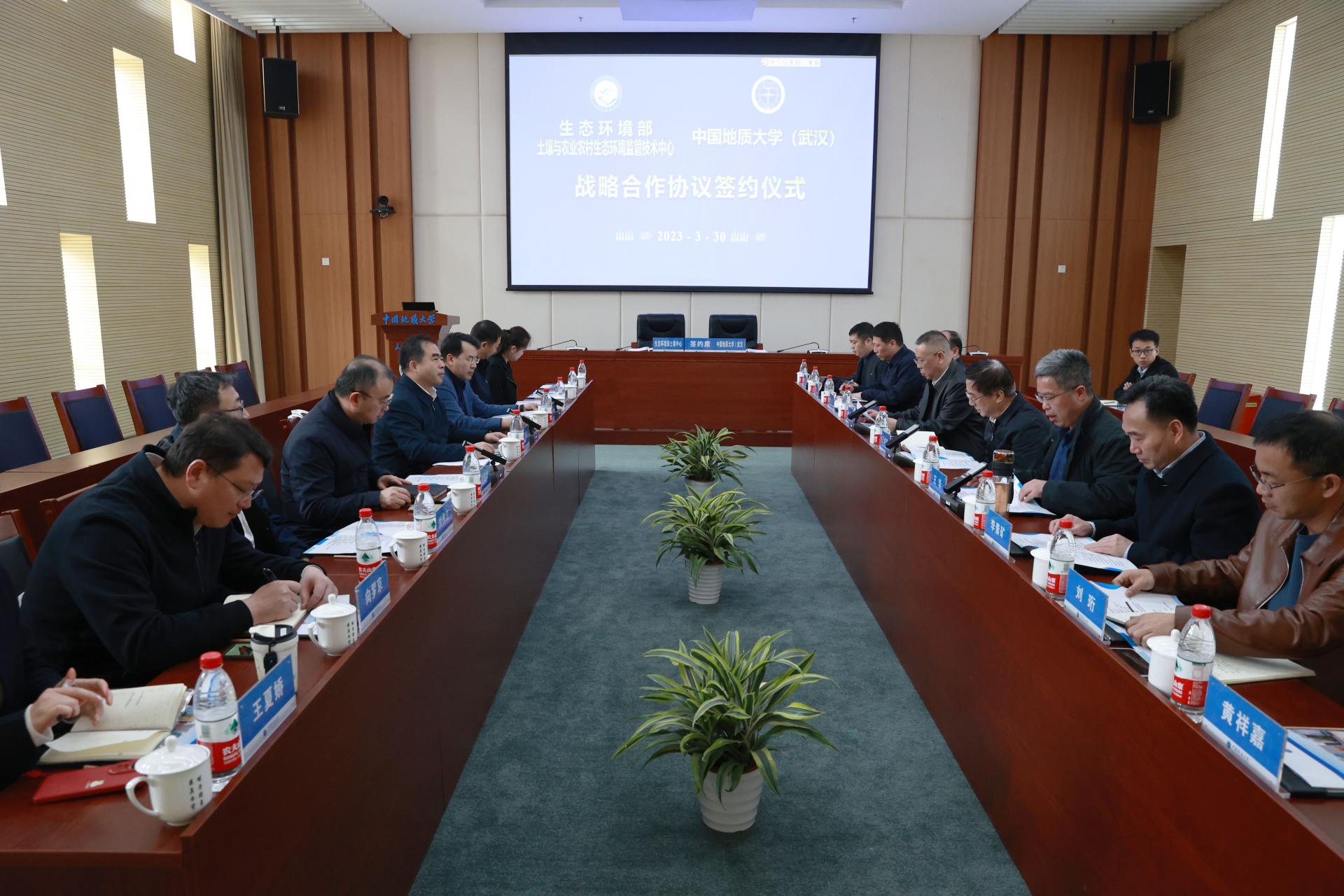 地大新闻网讯(通讯员 袁潇 摄影 赵婧萱)3月30日,生态环境部土壤与农业农村生态环境监管技术中心与我校在未来城校区签署战略合作协议。生态环境部土壤中心党委书记、主任洪亚雄,湖北省生态环境科学研究院党委书记、院长蔡俊雄,副院长向罗京,我校校领导王焰新、王华、唐忠阳参加签约仪式和座谈会。
