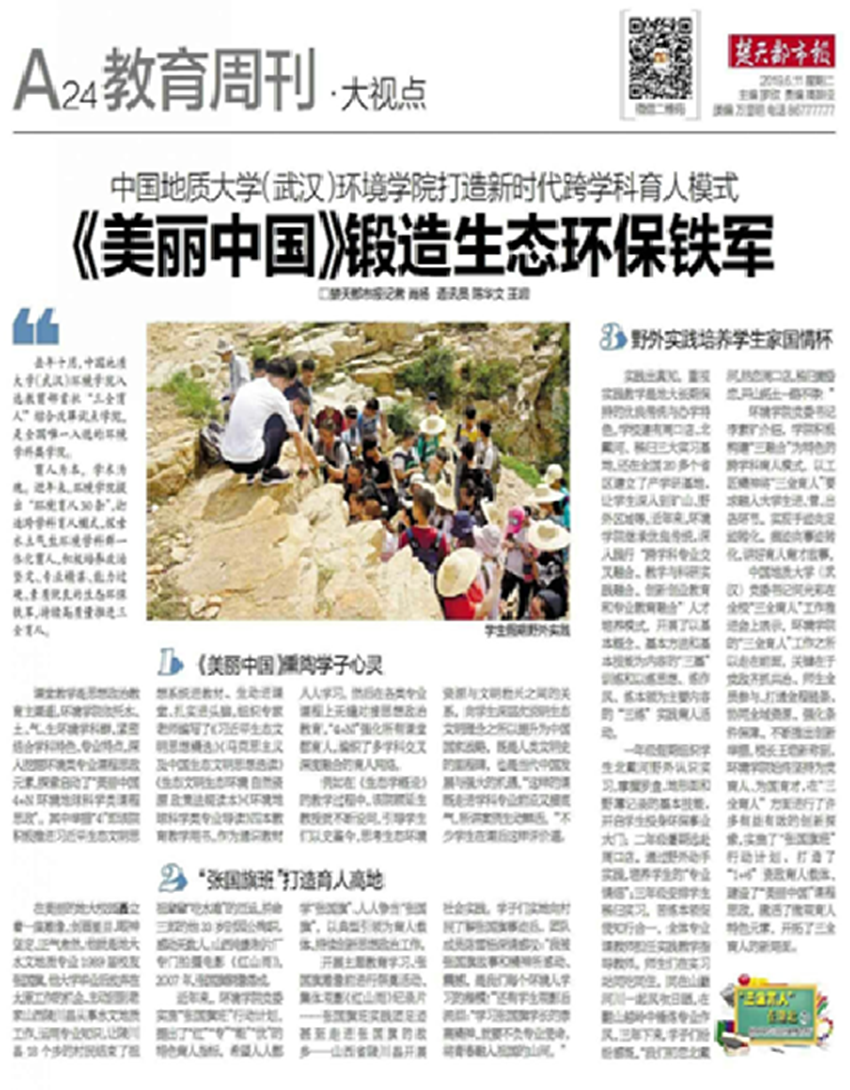依托北戴河、周口店、秭归、巴东四大野外教学实习基地和科研课题研究流域地,广泛开展社会实践和社会调查活动,积极开展以基本概念、基本方法和基本技能为内容的“三基”训练和以练思想、练作风、练本领为主要内容的“三练”实践育人活动,将课程思政从课堂延伸到实践教学一线。学院在全国20多个省区建立产学研基地,让学生深入到矿山、野外区域等提升专业本领,培养专业情怀。每年一册的《师生野外实习风采展》,生动记录和展现了环境学生行走在山水林田湖草沙间躬行的身影。学生走进社区、中小学校开展习近平生态文明宣讲,溯江而上奔赴长江源科考一线,在实践中不断擦亮新时代大学生社会主义生态文明观的底色,把论文写在祖国大地上。