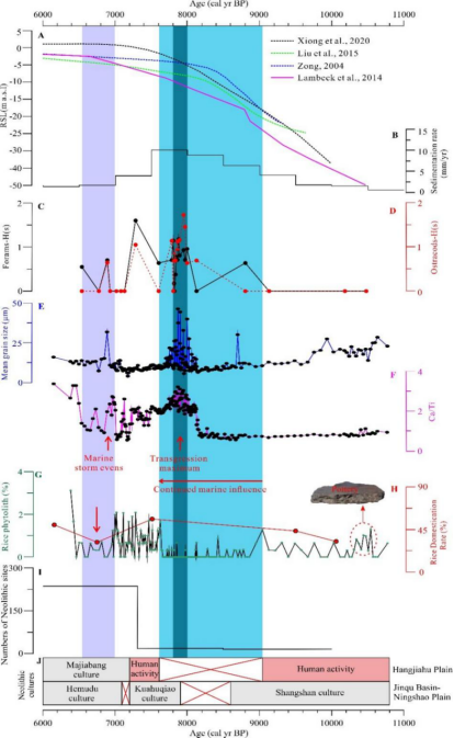 研究表明,受海平面活动控制的沉积地貌变化是制约沿海平原古人类活动的主要因素。论文报道的新石器早期古人类种植水稻的证据更新了传统认识,夹砂陶和水稻植硅体揭示杭嘉湖平原腹地新石器早期存在古人类活动,温暖的气候环境和广泛暴露的河漫滩湿地环境有利于古人类聚落形成与水稻种植。早全新世以来,沿海和内陆平原的古文化演化均受到了最大海侵的影响。7600 cal yr BP以后,海平面上升放缓并趋于相对稳定,滨海淡水沼泽湿地的出现再次促进了古文化发展,古人类重新回到沿海平原种植水稻。但与内陆平原相比,沿海平原的海洋风暴事件对人类活动影响显著,特别是7000-6500 cal yr BP期间频发的海洋风暴事件抑制了该时期水稻种植与驯化。我们的研究对于预测未来全球变暖背景下沿海环境演变趋势和极端海洋风暴事件对人类活动的影响具有重要参考价值。