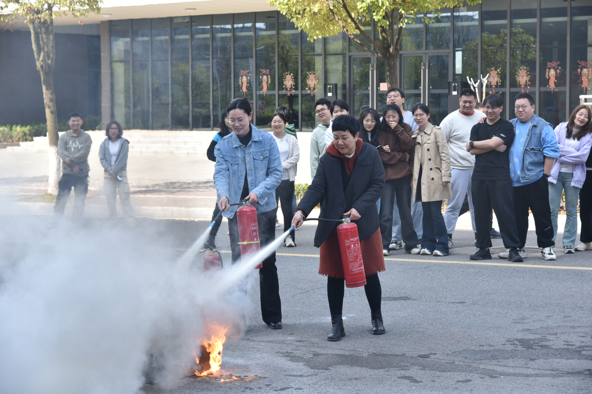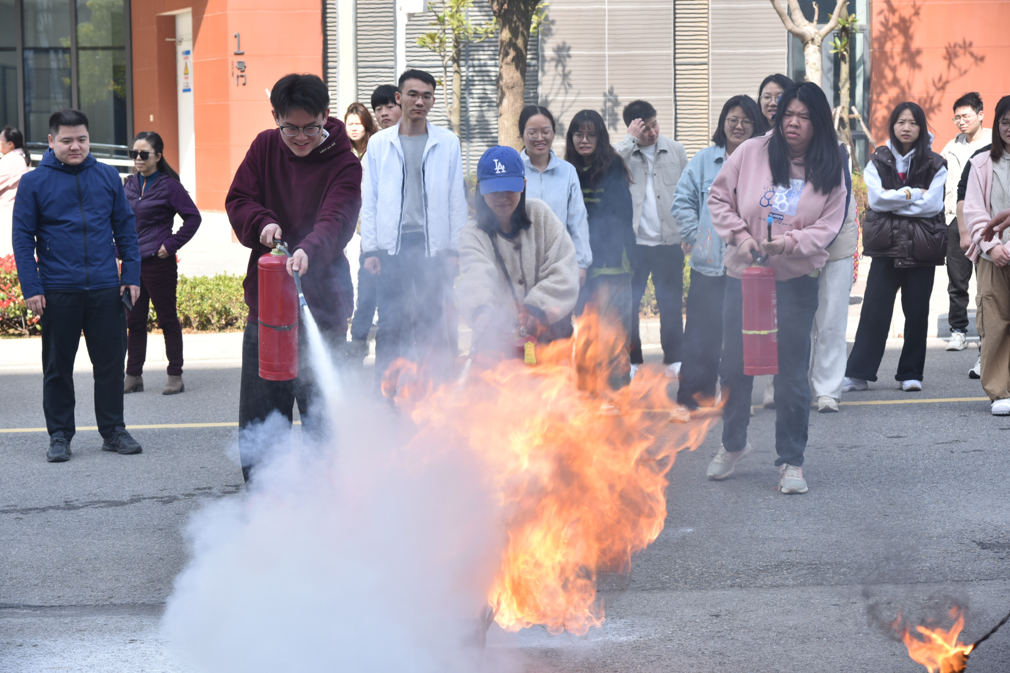 逃生演练结束后,参与演练师生集中学习灭火器使用方法。张献文结合实际,向全体师生介绍干粉灭火器、二氧化碳灭火器以及消防水管的构造和功能,并现场教授灭火器实际操作要领和技巧。