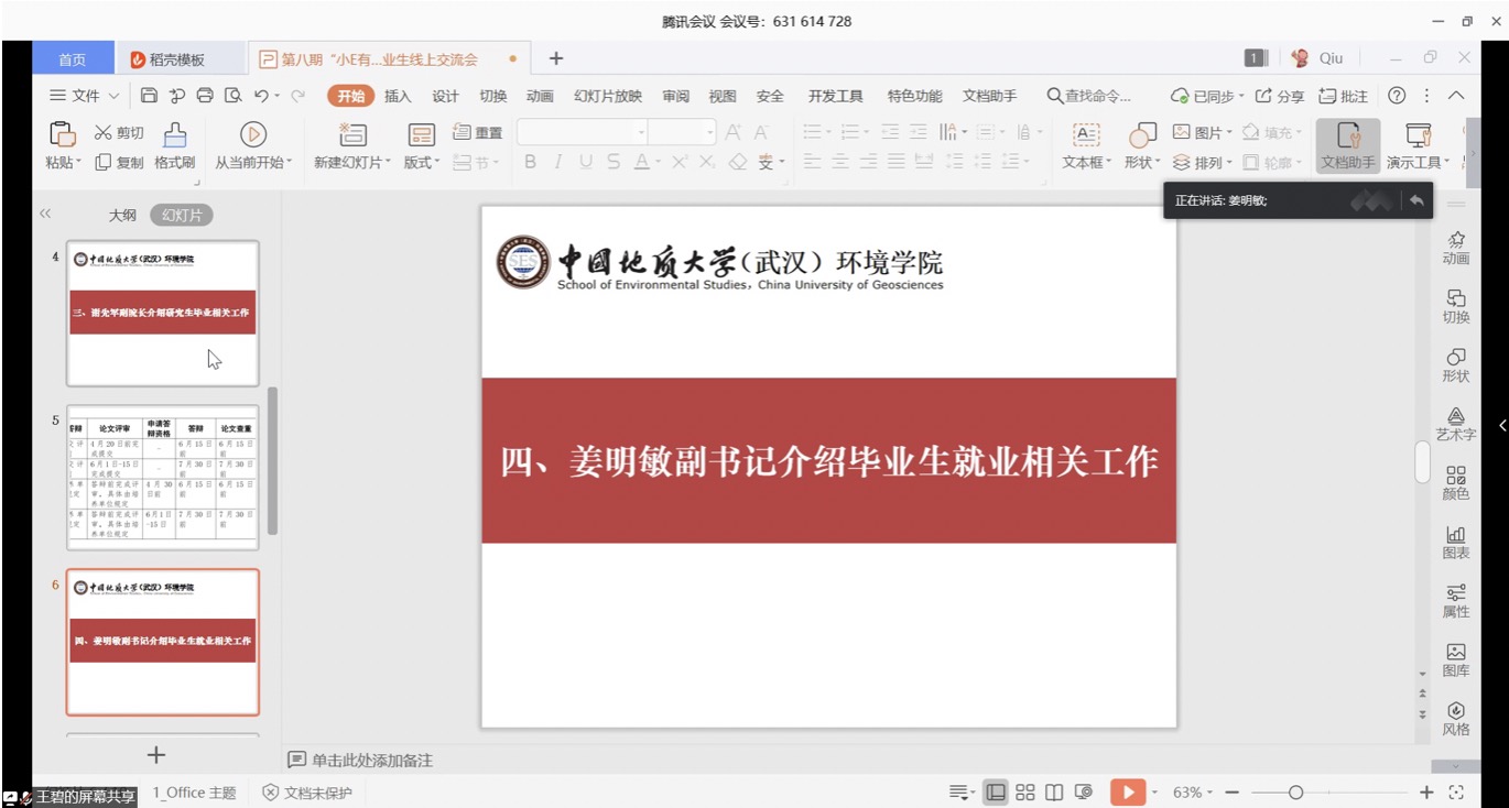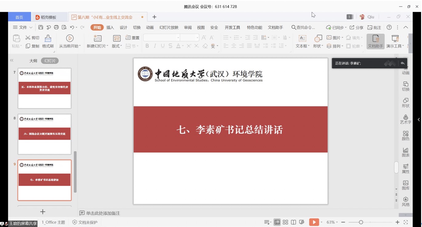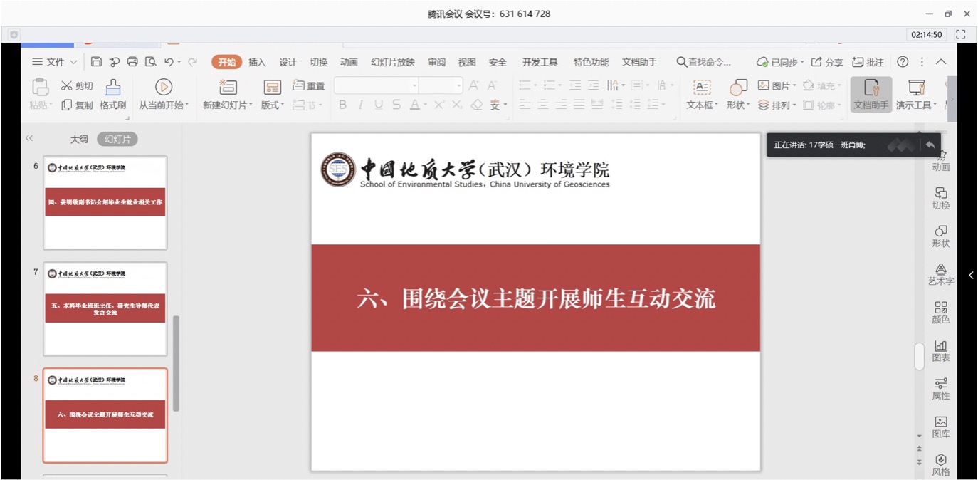 李素矿作总结讲话。他首先代表学院感谢老师和同学们在此次新冠肺炎防控战疫中做出的积极贡献。他说,时间如梭,转眼就到了同学们毕业、就业之际。往年的面对面、换成了今年的线上远程交流,疫情阻挡不了师生之间爱和友谊。他表示,对同学们此次“小E有约”师生线上交流会上提出的意见建议,学院立行立改,马上研究,及时回应。他指出,当前同学们面临毕业、就业两个主要问题,其中顺利毕业是高质量就业的前提和基础。行百里者半九十。同学们在最后一个学期,一定要精准学业,通过线上学习,修好学分、完成课程、做好毕设、写好论文,克服困难完成最后一公里的学业。打铁还需自身硬。面对就业,无论直接工作、升学读研、出国深造等哪种方式,同学们都要以积极的态度、满满的自信,做好人生规划,多与老师、同学、学长、家人、亲朋、用人单位等进行沟通交流,确定好的就业方式,尽早找到自己满意、幸福的社会第一站。他要求,全体班子成员、系室主任、党支部书记、全院教师、班主任、辅导员都要参与进来,彰显三全育人、党建标杆的力量,诠释“大爱” 精神情怀,关注关心毕业生们的学业、就业状况,解决好同学们的切身利益和具体实际困难。同学们所在的班团干部和党支部书记也要一起行动起来。全院上下一定要“拧成一股绳”,心往一处想、劲往一处使,为毕业生们做好指导帮助,履行好教育教学的出口这一关键环节。他强调,同学们要认真学习领会习近平总书记给北京大学援鄂医疗队“90后”党员的回信精神。牢记总书记的殷切期望和谆谆嘱托,践行生态文明思想,争做为国分忧、为民解困、红专能优的生态环保铁军,让自己的青春在党和祖国人民最需要的地方绽放绚丽之花,在实现中华民族伟大复兴的中国梦征程中书写自己的人生华章。最后他还提醒同学们,在当前疫情持续向好的态势下,一定要继续做好防护,居家学习生活,做到学习好、生活好、身体好。