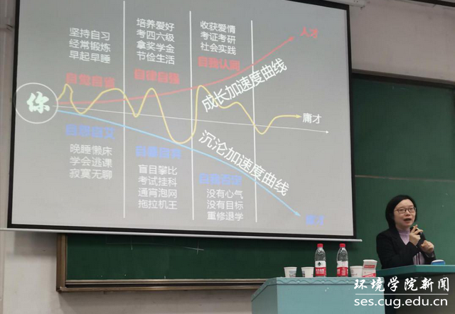 为帮助同学们正确认识和适应大学新生活,她以三种不同的人生成长曲线与同学们分析并探讨人才、庸才、废才三种人的生活行为表现。鼓励同学们自觉自省、自律自强、自我认同,期望同学们为自己的大学确立短期与长期的目标计划。