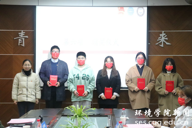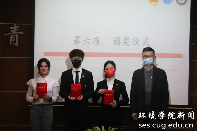 校团委组织宣传部主任陈文婷为获得三等奖的争做地大新青年队、啊对对队、四个意识牢记我心队、南望之声团队、东方朝阳队颁奖。