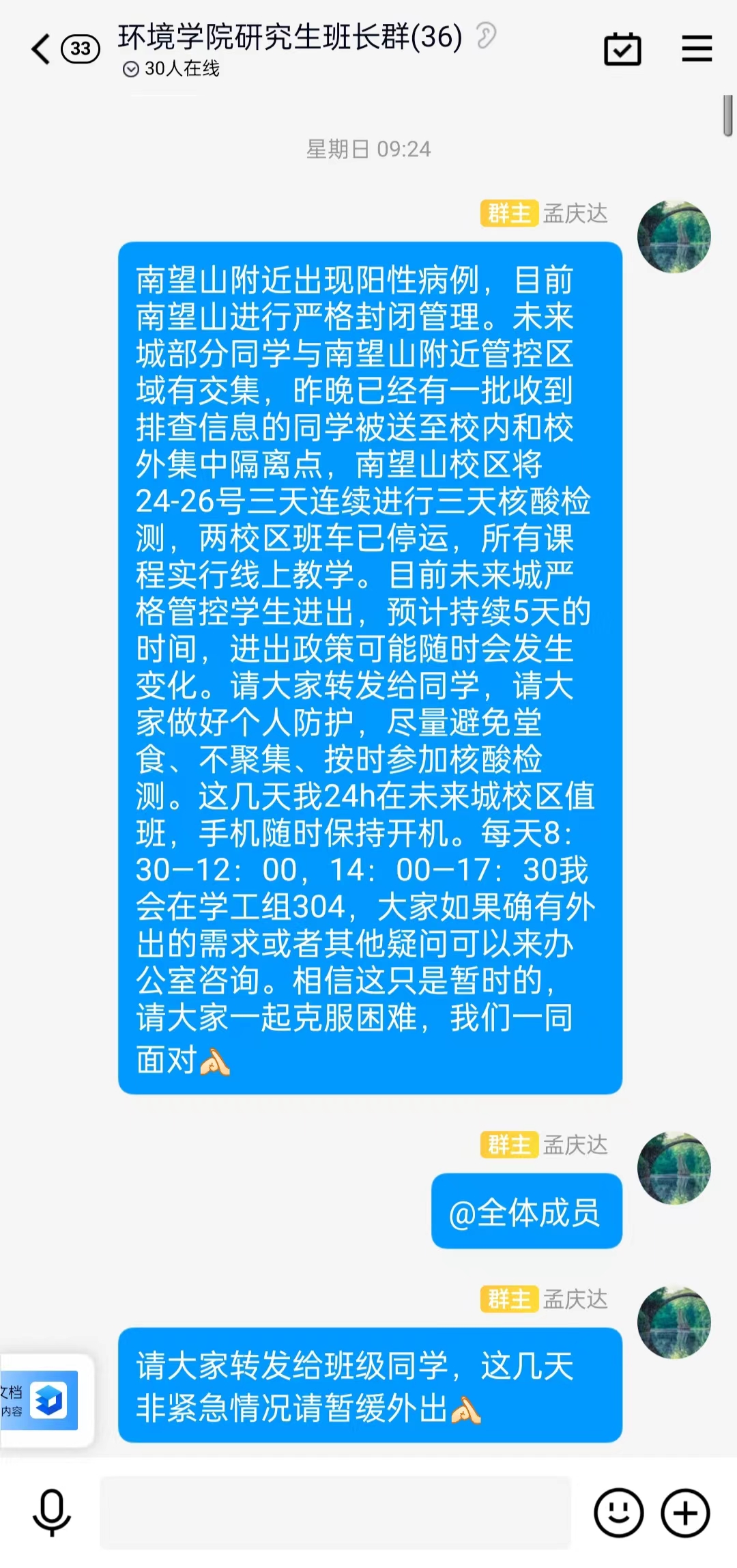 学工组专职辅导员们以在岗、在线、在位等多种形式,在学生宿舍、微信群、QQ群等岗位上落实疫情防控的各项举措。按照学院党委统一部署,他们迅速织密疫情防控工作网络,第一时间将官方通知和权威信息传递到每一位学生,做到信息全覆盖、全知晓;第一时间摸排学生情况,在校人数、集中健康监测人数、校外隔离人数、未返校人数等,牢牢掌握全体本研学生的信息。“点对点”盯好重点人头核酸检测“一次不差”,“面对面”指挥全员核酸摸排“一个不漏”,“键对键”落实“日报告”“零报告”制度“雷打不动”,他们层层加固疫情防线堡垒,用每一个精准的学生数据构筑起疫情防控的安全网络。充分发挥思想政治优势和密切联系学生优势,用实际行动践行“立德树人”的初心使命,贯彻落实“学生在哪里,思想政治教育就在哪里”的工作信念。第一时间通过网络平台召开疫情防控主题年级大会、党员大会、班团会等,引导学生从身边故事中汲取精神养料,在关注国情中强化制度自信。